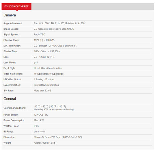 Hikvision DS-2CE16D0T-VFIR3E 2.0 MP HD1080P IR Bullet Camera