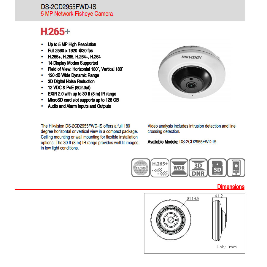 - دوربین دام 5 مگاپیکسل Fisheye هایک ویژن مدل DS-2CD2955FWD-IS