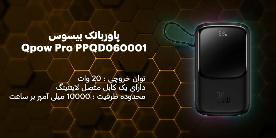 - پاوربانک بیسوس مدل Qpow Pro PPQD060001 20W ظرفیت 10000mAH همراه کابل متصل لایتنینگ