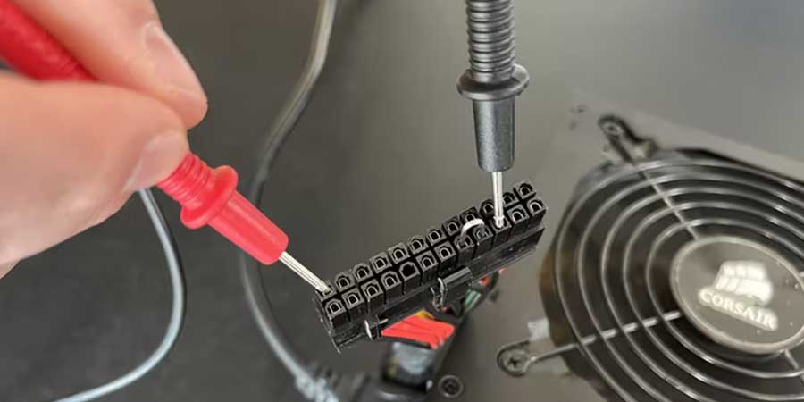 برای انجام تست به کمک مولتیمتر میتوانید متوجه شوید که اتصال و ولتاژ بین تمام پینهای مختلف وجود دارد یا خیر. برای انجام این امر، فقط باید پایه Power On و یک پایه زمین مجاور را با یک جامپ کوتاه کنید. سپس میتوانید یکی از پروبهای مولتیمتر را به یکی از پایههای زمین و سپس به هر یک از پایههای دیگر روی پایه کانکتور متصل کرده و بررسی نمایید که آیا ولتاژ درست است یا خیر. به طور کلی انجام تست پاور با مولتیمتر روش جالب و جذابی است، زیرا تهیه آن ساده بوده و استفاده از آن نیز سخت نیست.