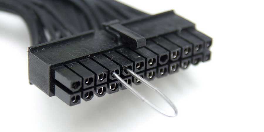 این یکی از روش های آسان بوده و جزئیات کمی نیز دارد و حداقل می تواند به شما کمک کند که متوجه شوید که آیا پاور شما روشن میشود یا خیر. برای انجام این تست نیاز به یک گیره کاغذ یا یک تکه سیم با گیج 16AWG یا 18AWG دارید. می توانید یک ابزار پل بلوز نیز خریداری نماید که شاید کمی غیر ضروری به نظر برسد. حال برای آغاز تست، بر فرض مثال پاور شما داخل کیس کامپیوتر قرار دارد.